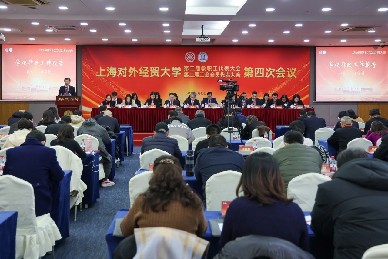 1月13日,上海对外经贸大学第二届教职工代表大会暨工会会员代表大会第四次会议在松江校区举行。校党委书记祁明,校长汪荣明,校党委副书记、工会主席吴毅,校党委副书记、纪委书记章益国,党委副书记、副校长沈艺,副校长徐永林、副校长姜秀珍出席会议,上经贸大附属松江实验学校党总支书记张辉应邀出席。学校教代会暨工代会108名正式代表出席会议。会议还邀请各单位、部门负责同志,各民主党派基层组织负责人、二级工会主席、工会经审委委员等列席会议。