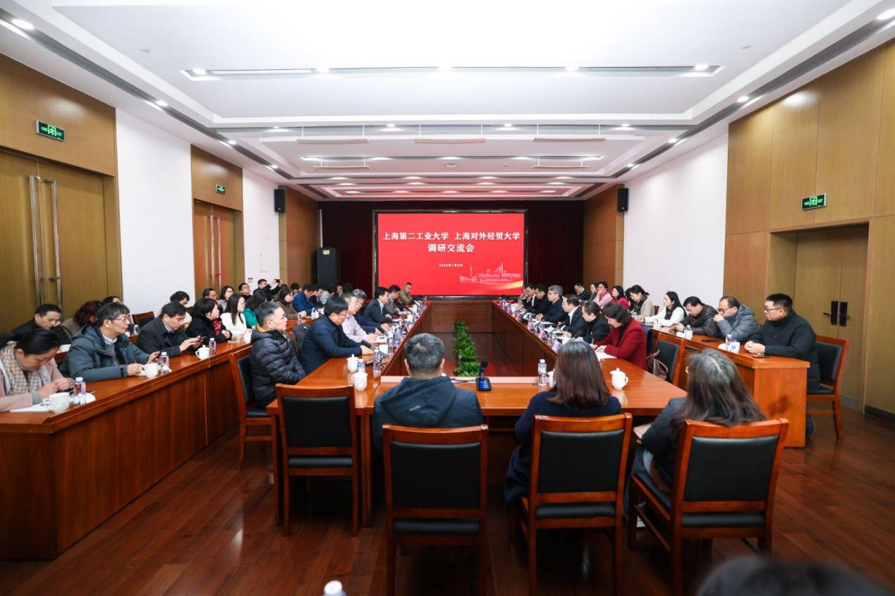 1月3日上午,上海第二工业大学党委书记陆敏、党委副书记吴沛东一行六十余人来校调研交流,就如何服务国家重大战略和地方经济社会高质量发展,建设高质量智库等方面进行交流座谈。校党委书记祁明,党委副书记吴毅出席。有关部门负责同志参加会议。祁明代表学校对陆敏一行表示热烈欢迎,他简要介绍了学校的办学历史和基本情况,重点分享了学校在学科专业优化布局、人才培养模式创新、国际化办学品牌打造、智库建设与功能发挥、扩大对外战略合作等方面取得的成绩和改革举措。他表示双方在人才培养、教育教学、学科专业建设等诸多方面都有巨大的合作空间,希望两校能够继续加强深入交流,互学互鉴,开展精准对接、谋划务实举措,共同推动两校在服务国家战略和上?!拔甯鲋行摹苯ㄉ璺矫孀鞒龈蠊毕住B矫舳匝5娜惹榻哟硎靖行?,对学校长期深耕对外经贸领域,服务高水平对外开放进程中作出的重要贡献表示肯定,尤其是在特色优势学科建设和决策咨询服务等方面的经验值得借鉴学习,希望借此次调研交流学习的机会,深化拓展合作领域,推动两校在高质量发展中互助共赢?;嵋橛晌庖阒鞒?。国际经贸创新与治理研究院和国际组织学院(贸易谈判学院)相关同志参加会议并作交流。会前,
