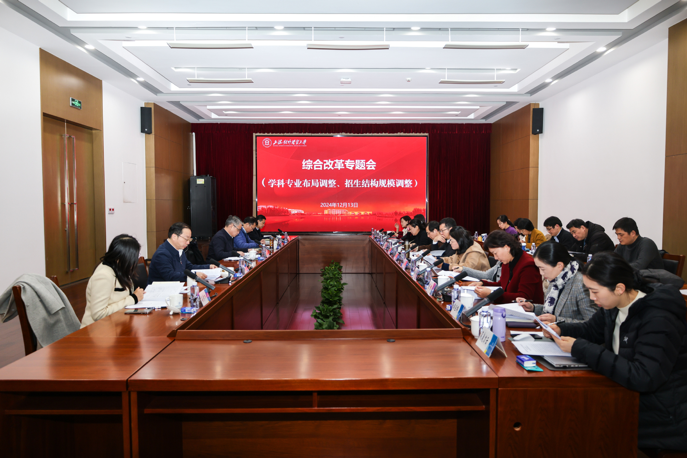 为深入学习贯彻党的二十届三中全会精神和全国教育大会精神,进一步围绕上海市以高等教育“两个先行先试” ,凝心聚力加快推动深化教育综合改革工作,12月9日至17日,校党委书记祁明、校长汪荣明主持召开五场深化教育综合改革专题研讨推进会,全体校领导、党委常委、学校综合改革专班成员以及部分学院院长等参加会议?;嵋樘×朔⒄构婊Α⒌澄橹?、人事处、教务处、科研处、招生就业处等各专项工作组,围绕学科专业布局调整、学校内部治理、人力资源布局优化和人事制度改革、人才培养模式改革、科研创新服务改革、招生结构规模调整、高质量国际合作交流改革等方面进行方案汇报。与会人员分别对各专项组的改革方案进行研讨。祁明在讲话中对各个专项工作推进成效予以肯定,同时就持续推进综合改革工作,提出要求:一是要提高站位,紧紧围绕立德树人根本任务,要从国家和上海市的重大战略部署中深刻认识和把握深化教育综合改革的重大意义,明确改革任务的核心内涵和实质要求。二是要充分发挥“外”“经”“贸”特色优势,深化内涵建设,统筹把握办学理念、办学定位、学科布局、人才培养模式、人才布局、人事制度、内部治理等改革重点,注重改革各方案的上下贯通、协调