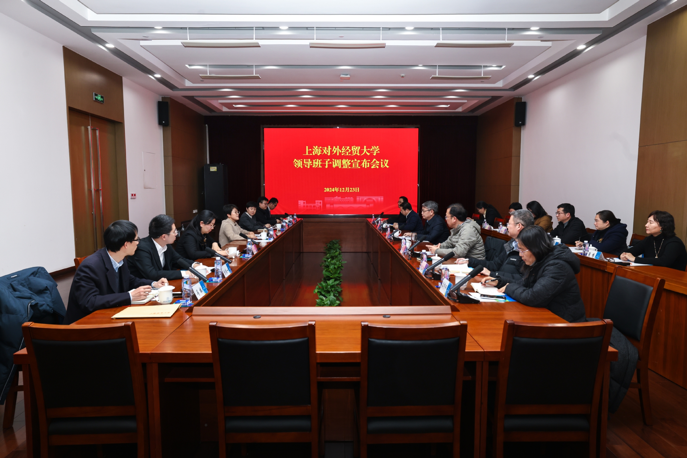 12月23日下午,上海对外经贸大学领导班子调整宣布会议举行?;嵋樾剂酥泄采虾J形龆?,沈艺同志任上海对外经贸大学党委副书记、副校长。市教卫工作党委一级巡视员郑锦同志出席会议并讲话。市委组织部宣教科技干部处处长方颖同志宣读了市委任职决定。校党委书记祁明同志,党委副书记、校长汪荣明同志,党委副书记、副校长沈艺同志分别做了表态发言。市委组织部、市教卫工作党委有关同志、上海对外经贸大学领导班子成员、党委常委及有关部门负责人等参加会议。
