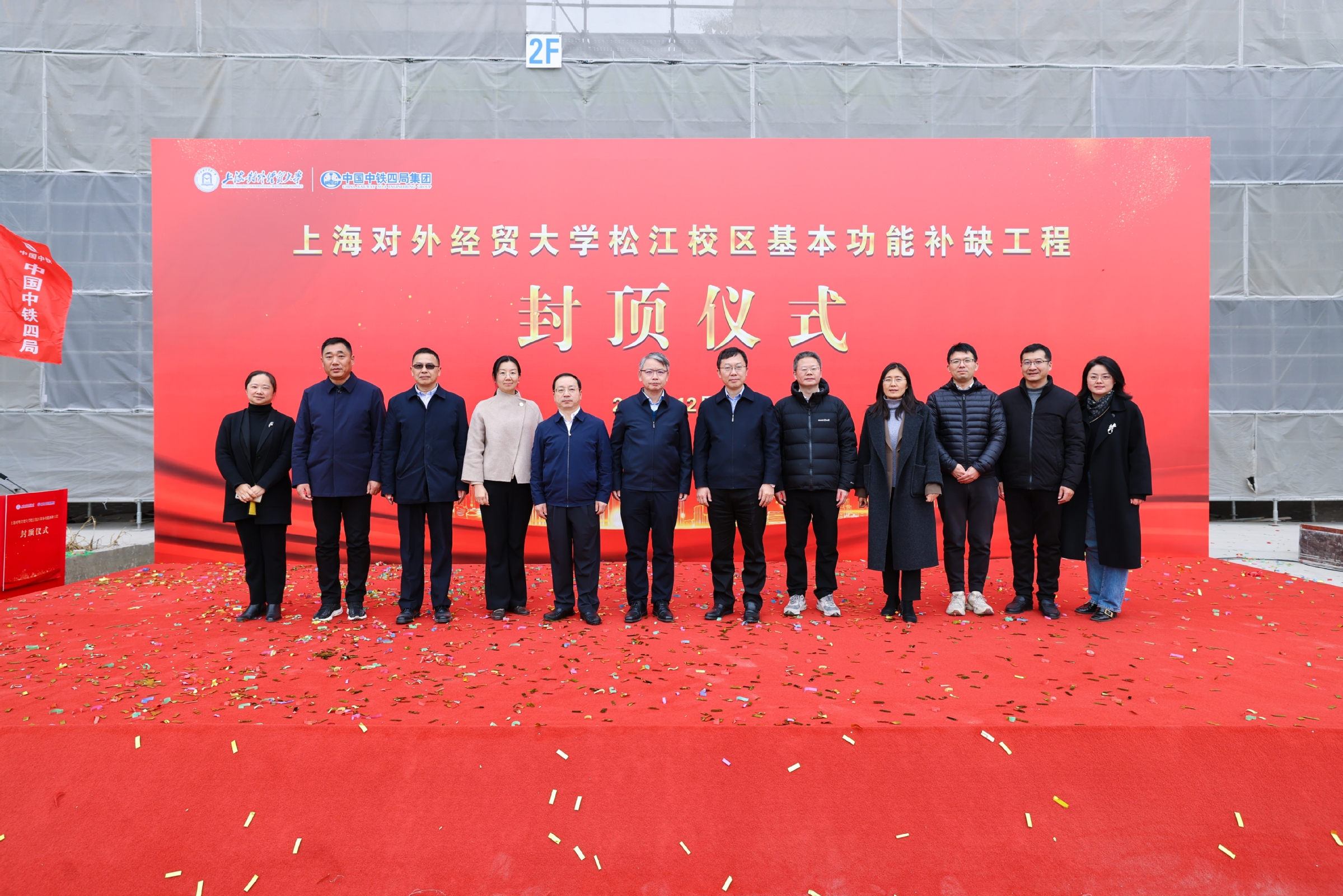 12月30日,随着最后一斗混凝土完成浇筑,上海对外经贸大学松江校区基本功能补缺工程建设迎来里程碑节点,项目主体结构顺利实现封顶!这标志着项目稳步迈入新阶段。中午12:18,上海对外经贸大学松江校区基本功能补缺工程封顶仪式在松江校区顺利举行。校党委书记祁明,校长汪荣明,党委副书记吴毅,党委副书记、纪委书记章益国,党委副书记、副校长沈艺,副校长徐永林,副校长姜秀珍,校党委常委陈加林、郭茜、许继亮,校内各单位、各部门党政负责人,部分教师代表及施工总包、勘察设计、工程监理、财务监理、代建等参建单位代表出席封顶仪式。仪式由副校长徐永林主持。施工总包单位中铁四局集团有限公司李超伟总监代表参建单位向项目封顶发表致辞,他表示将以本次封顶为新的起点,持续秉承中铁四局“勇于争先、永不满足”的企业精神,牢记“诚信、宽容、博学、务实”的校训,大力弘扬“工匠精神”,锚定目标、科学部署,精心组织实施,强化工序衔接,始终以高度的责任感和使命感,严格把控工程质量,为补缺工程的早日投入使用贡献力量。校长汪荣明在致辞中向参建各方的建设者们致以最诚挚的敬意和最衷心的感谢。他表示,项目的成功封顶,呼应着学校事业蒸蒸日上的好势