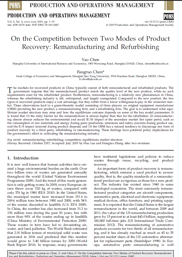 2019年12月,工商管理学院陈瑶副教授作为第一作者与上海交通大学陈方若教授合作的论文《On the