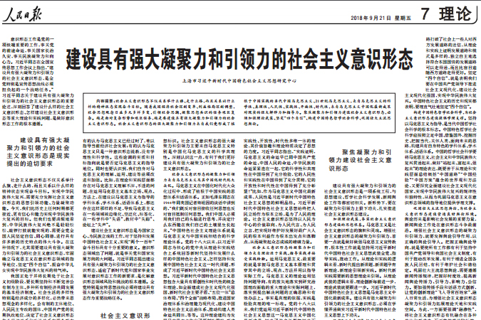 9月21日,《人民日报》理论版头条刊发我校马克思主义学院赵勇教授执笔的文章《建设具有强大凝聚力和引领力的社会主义意识形态》。文章提出社会主义意识形态不仅关系举什么旗、走什么路,而且关系以什么样的精神状态实现奋斗目标。随着我国经济社会深刻变革、利益格局深刻调整,社会思想观念日益多元多样多变,引领社会思潮、凝聚思想共识的任务艰巨复杂。越是面对复杂形势和艰巨任务,越是要建设具有强大凝聚力和引领力的社会主义意识形态。社会主义意识形态的强大凝聚力和引领力来自我们党形成了植根于中国实践的当代中国马克思主义、21世纪马克思主义,来自马克思主义的科学性、真理性、人民性、实践性、开放性、时代性,来自马克思主义中国化最新成果对现实的强大解释力和指导力。聚焦凝聚力和引领力建设社会主义意识形态,必须加强理论武装、坚定“四个自信”、构建中国特色哲学社会科学、巩固壮大主流思想舆论。该文随即在人民网、光明网、中国社会科学网、全国哲学社会科学办公室网站等主流媒体全文转载。