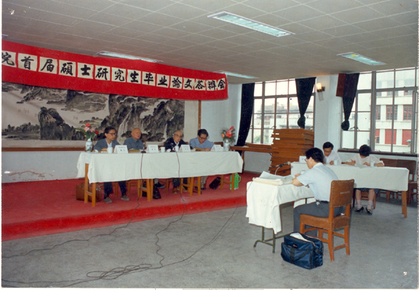1987年周汉民参加学校首届研究生毕业论文答辩会,评委席右二为其导师裘劭恒