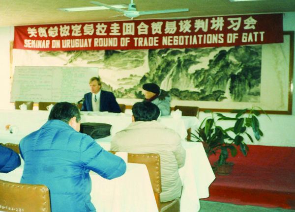 汪尧田(左二)与中国参加“复关”谈判的首席代表沈觉人(左一)参加国际研讨会