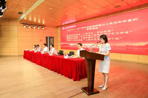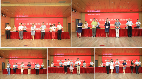 陈洁副校长宣读了《关于2016-2017学年度获得校级以上奖项和荣誉的表彰通报》和《关于2016-2017学年度获得校级奖项和荣誉的表彰决定》。随后,校领导分别为从教30年证书获得者、2016年“教学标兵”、2017年度“科研标兵”、2017年全英语教师“教学质量奖”获得者以及获得“记功”和“优秀”表彰的代表颁奖。