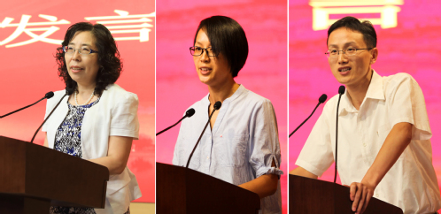 从教30年教师代表、马克思主义学院党总支书记秦淑娟,科研标兵、统计与信息学院范彩云,全英语教师“教学质量奖”获得者、法学院吴晓锋先后作交流发言。秦淑娟老师交流了从教30年的心路历程,最后她深情地说,“选择教师职业,人生无悔;致力教书育人,初心永恒。”范彩云老师充满激情地结合个人科研工作谈了三点体会,“因兴趣而产生梦想;持之以恒的努力;广泛而有效的交流合作?!蔽庀胬鲜毓肆怂⒂镅暗钠裘衫?,感恩他的老师以及学生,感恩学校坚持英语教学的传统。三位老师的发言让与会师生深切感受到了作为高校教师的荣誉感、责任感、获得感与幸福感。