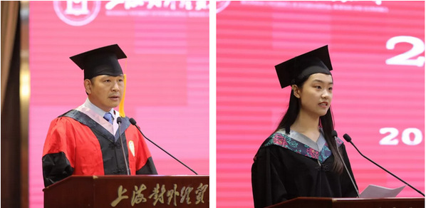典礼上,校领导分别向获得上海市优秀毕业生、学校优秀毕业生的毕业生代表颁发了荣誉证书,校党委书记殷耀向基层就业先进个人段雁鑫、陆凌妍、李晓明和闫丁丁授牌。法学院院长倪受彬作为教师代表发言。发言中,他回顾了我校裘邵恒教授、汪尧田教授等老一辈贸大人的民族大义和家国情怀,并寄语毕业生们迎接挑战、担当责任,实现丰盈的人生旅程,不辜负伟大的时代。统计与信息学院张宁同学代表全体本科毕业生分享了在学校学习生活的点滴以及追求梦想的心路历程,她在发言中饱含对学校、老师的感恩和对四年学习生涯的怀念。