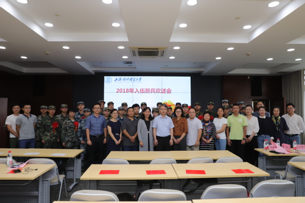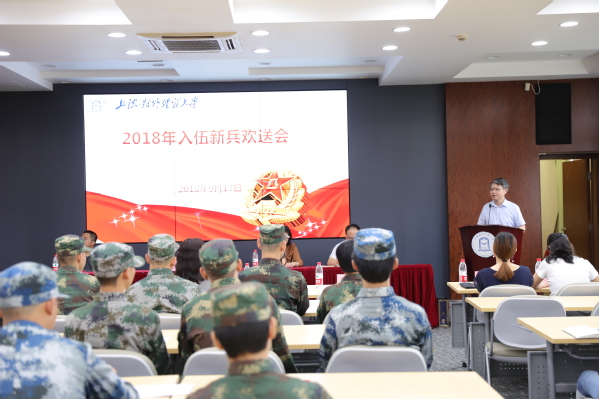 9月17日上午, 2018年新兵入伍欢送会在图文信息楼503举行,校党委副书记、副校长祁明,武装部部长许继亮,各学院党委(总支)副书记、辅导员,全体入伍新兵及部分家长出席欢送会?;嵋橛裳Чげ扛辈砍こ掠被灾鞒?。