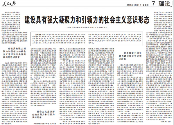 9月21日,《人民日报》理论版头条刊发我校马克思主义学院赵勇教授执笔的文章《建设具有强大凝聚力和引领力的社会主义意识形态》。文章提出社会主义意识形态不仅关系举什么旗、走什么路,而且关系以什么样的精神状态实现奋斗目标。随着我国经济社会深刻变革、利益格局深刻调整,社会思想观念日益多元多样多变,引领社会思潮、凝聚思想共识的任务艰巨复杂。越是面对复杂形势和艰巨任务,越是要建设具有强大凝聚力和引领力的社会主义意识形态。社会主义意识形态的强大凝聚力和引领力来自我们党形成了植根于中国实践的当代中国马克思主义、21世纪马克思主义,来自马克思主义的科学性、真理性、人民性、实践性、开放性、时代性,来自马克思主义中国化最新成果对现实的强大解释力和指导力。聚焦凝聚力和引领力建设社会主义意识形态,必须加强理论武装、坚定“四个自信”、构建中国特色哲学社会科学、巩固壮大主流思想舆论。