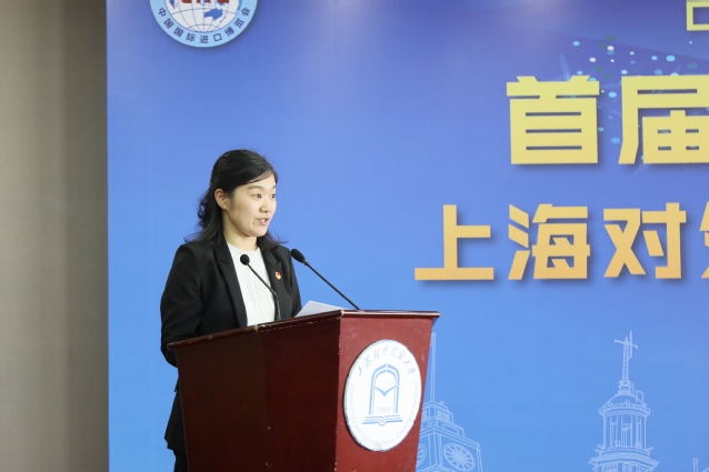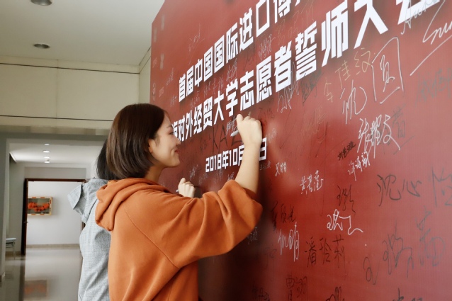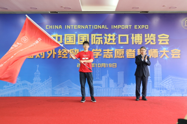 进博会志愿者代表、来自国际经贸学院的魏卓成同学发言。她分享了对于进博会的理解和认识,讲述了她和父亲以不同的角色助力进博的故事,结合自己的志愿服务经历,指出了志愿服务的要义,阐释了知行合一的重要意义,并代表全体志愿者表态,将以积极的态度、饱满的热情,认真严谨的完成服务工作,展现新时代青年大学生风采。