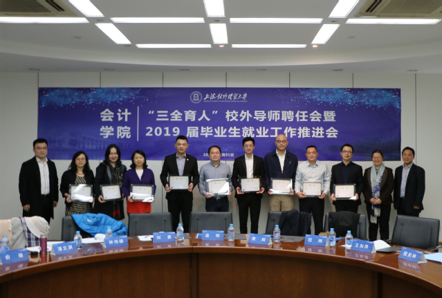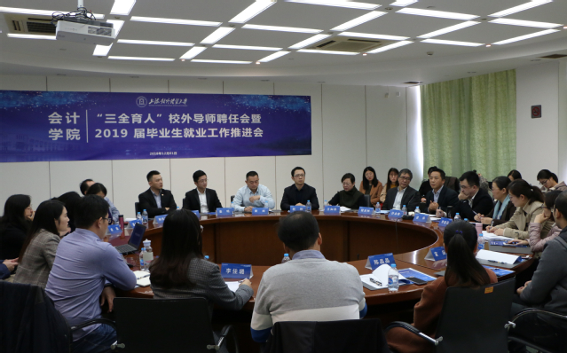 为深入贯彻落实全国思想政治工作会议精神和全国教育大会精神,进一步完善会计人才的培养模式和创新实践平台建设,发挥好校外导师的协同育人作用,构建“三全三圈”的育人同心圆,促进学生的全面发展,12月1日,会计学院隆重举办了“三全育人”校外导师聘任会暨2019届毕业生就业工作推进会。会计学院党委书记谈华、院长李婉丽,学生处副处长许永胜,会计学院党委副书记张莉莉、副院长程安林,校外导师以及会计学院师生代表参加了此次会议?;嵋橛烧爬蚶蛑鞒帧?/span>