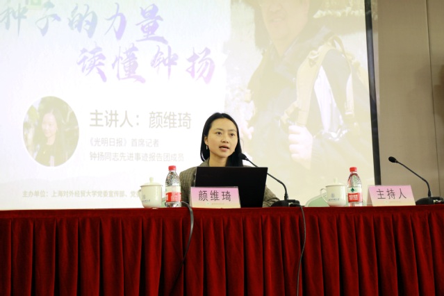 讲座中,颜维琦用选择、勤奋、并联三个关键词引入,向听众展现了一个全面而真实的钟扬教授。颜维琦首先介绍了钟扬教授的生平经历,以及主要的科研成果。特别是钟扬教授放弃国外优厚的条件,毅然携妻儿回国进行科学研究,展现了他一心为家国的博大胸怀。随后,颜维琦通过手写的时间计划表以及同事的回忆,讲述了钟扬教授忘我的工作状态和严谨的工作作风。她谈到,第一次采访钟扬教授的经历让她印象深刻。当时,钟扬教授刚脱离生命危险就全身心的投入援藏事业,哪怕生命受到威胁也要再次上高原的“四不像精神”让她动容。她向大家介绍了钟扬教授在科研工作、援藏工作、科普工作和管理工作中取得的成绩。钟扬教授在生态?;ひ约氨;の镏侄嘌苑矫娴姆崴冻晒?;为西藏大学的生物学科弥补了大量空白,培养了大批生物学人才;热心科普工作,每年举行30多场公众科普讲座,被称为最会讲段子的科普达人。最后,颜维琦用“他就像一团火,热烈是他人生最鲜亮的色彩;他就像一盏灯,温暖是他生命的底色”高度赞扬了钟扬教授作为一名党员教师,把生命最宝贵的时光献给在祖国最需要的地方的崇高理想。