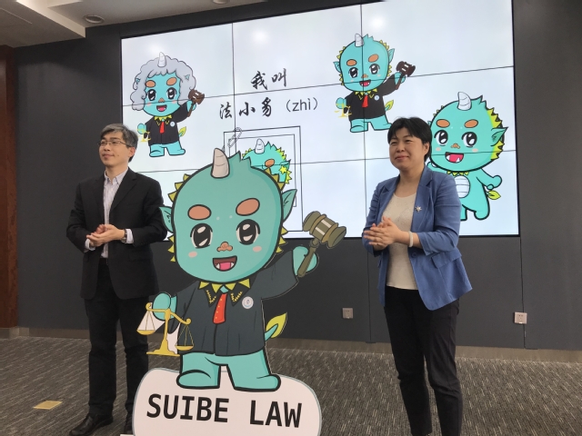 仪式上,许玫和唐旭生为法学院吉祥物"法小豸"揭幕。
