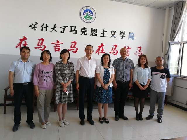 秦淑娟、刘海泉与喀大马院党总支书记、党委组织部副部长朱新翔、副书记夏文煜及部分教师进行了座谈。秦淑娟介绍了我校马院学习贯彻落实习近平总书记在学校思想政治理论课教师座谈会上重要讲话精神的具体做法,并表达了为喀大马院提供在线课程建设资源,分享思政课教学改革成果的意愿。刘海泉介绍了《毛泽东思想和中国特色社会主义理论体系概论》课程、《古诗词鉴赏》在线课程建设情况,双方并在线课程资源共享、思政课社会实践教学以及课程思政等合作进行了沟通和交流,表示将以此为契机,加强两校马院的合作,共同推动马院发展。