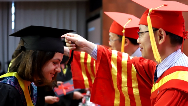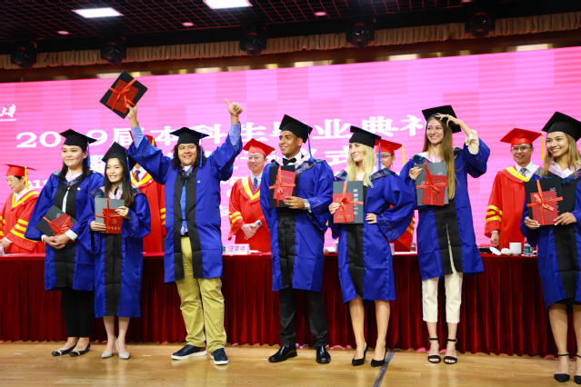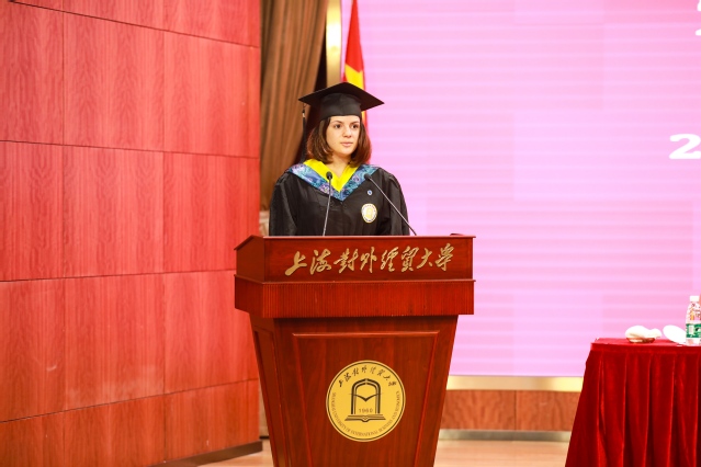 俄罗斯留学生尤萨作为留学生毕业生代表发言。她是上海市政府奖学金生和我校优秀毕业留学生,代表我校参加上海市高校留学生龙舟比赛,并率队夺冠。未来,她将继续在我校攻读硕士。尤萨则认为要继续传递好中国故事,带着SUIBE印记走向世界各地,并将四年努力化成通往未来的阶梯。