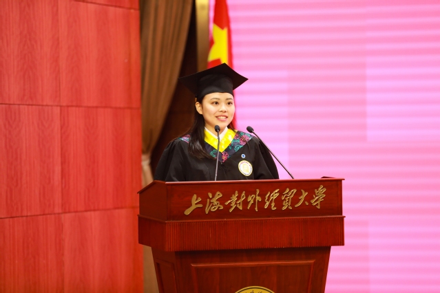 国际经贸学院许洁代表2019届本科毕业生发言。许洁在校期间乐于奉献,积极进取,品德高尚,学业一流,荣获国家奖学金等荣誉,斩获全国高校精英挑战赛国际贸易竞赛一等奖等奖项。她在发言中感谢老师对学生的悉心指导,帮助他们开启智慧之门。感谢母校不仅授予知识,更培养了品格,母校让她懂得了拼搏成就自我,真理光芒永不褪色,学会做真我。她表示,今年不仅是自己毕业之年,更是祖国70华诞,应责无旁贷地接过历史的接力棒,以青春之我奋斗之我,创造青春之中国。
