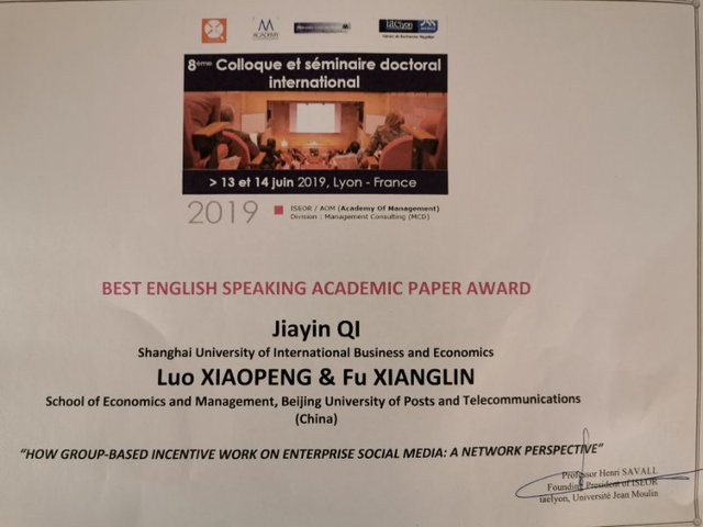 美国管理学学会(Academy of Management,AOM) 管理咨询分会 (Management Consulting Division, MCD)2019年国际会议暨博士生论坛(AOM MCD 8thINTERNATIONAL CONFERENCE AND DOCTORAL CONSORTIUM)于6月13日到14日在法国里昂的里昂第三大学举行。本次会议主要议题包括:变革管理的理论与实践、增强理论与实践关系的方法研究、变革管理绩效评估等?;嵋樵市硖峤环ㄎ?、英文、西班牙文三种语言的论文?;嵋槁加寐畚?/span>179篇,参会人数200多人,覆盖全球四大洲的三十个多个国家和地区。我校齐佳音教授应邀出席会议并报告了研究团队合作完成的英语论文“How group-based Incentive work on enterprise social media: a network perspective”(群体激励如何在企业社交媒体中发挥作用:网络的视角),该论文获得本次会议最佳会议英文学术论文奖。