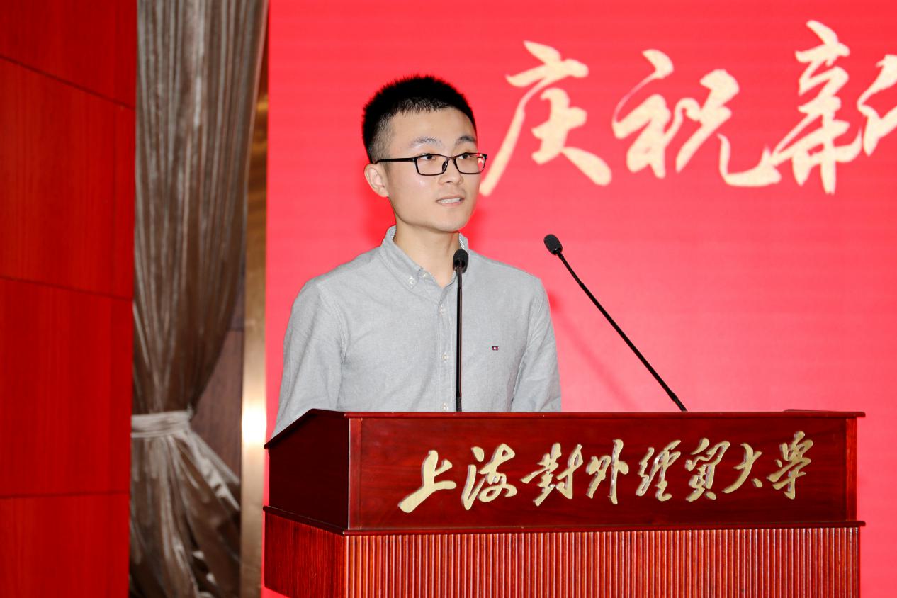国际经贸学院2016级经济学创新实验班沈梓暘发言,代表全体学生向所有孜孜不倦、辛勤耕耘的老师们致以节日的祝福。他分享了自己及身边同学的受教于老师而收获丰厚的故事,用“饮其流者怀其源,学其成时念吾师”表达了对恩师培养的感激之情。