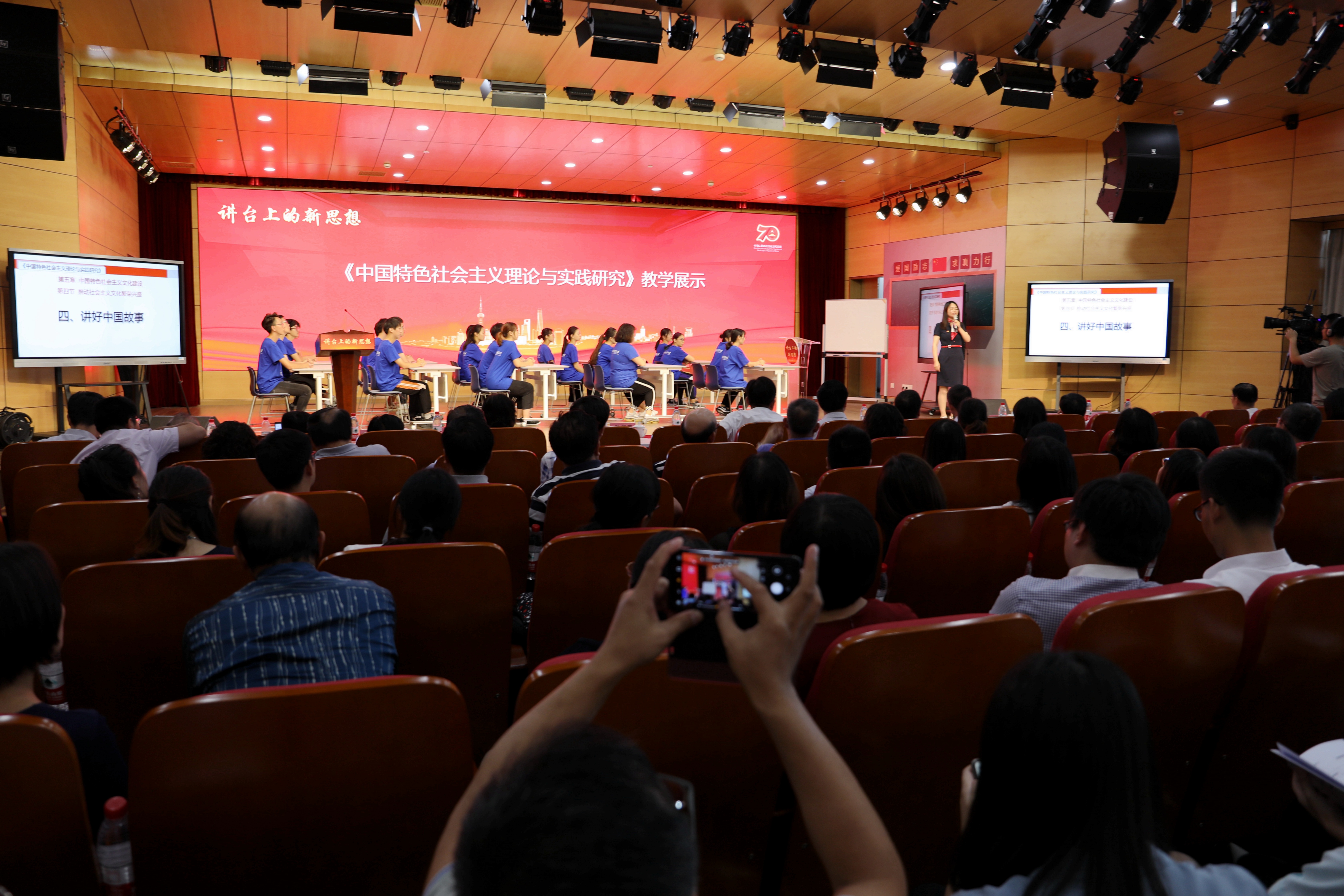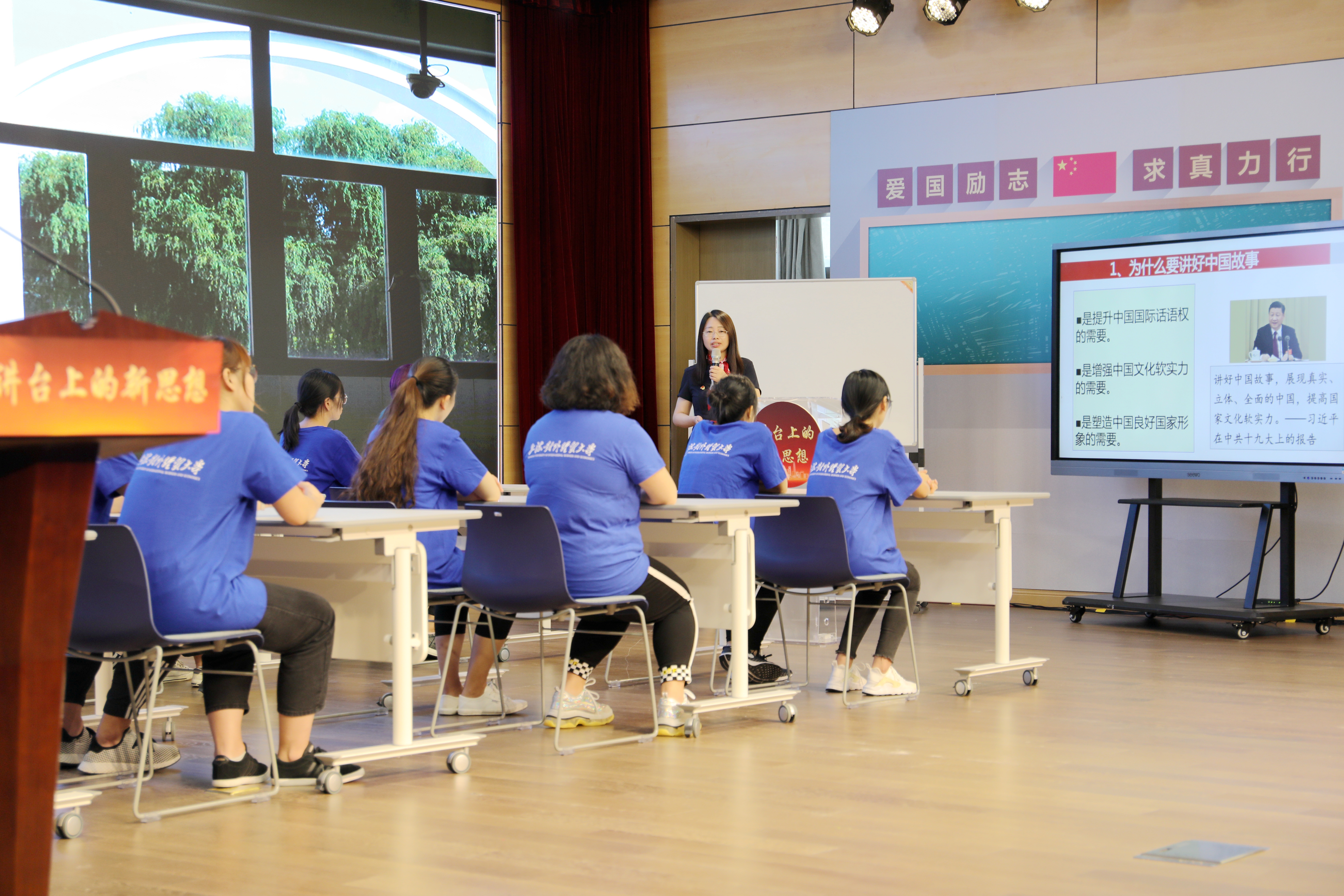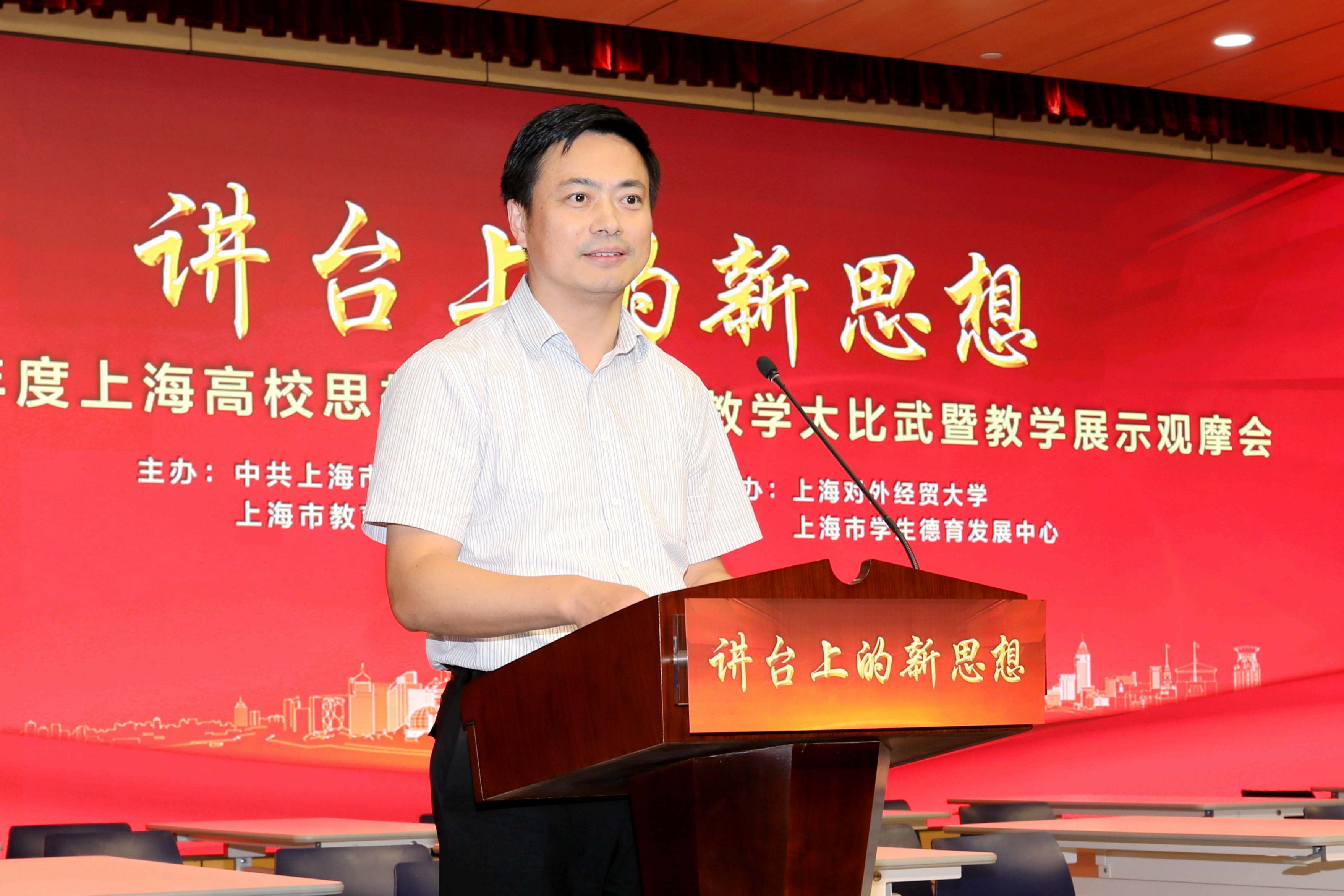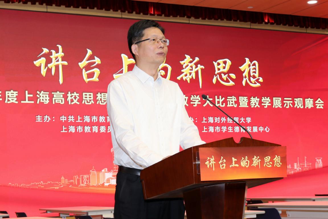 9月18日,2019年度上海高校思想政治理论课教学大比武决赛暨教学展示观摩会在我校举行。来自全市的54名思政课骨干教师,聚焦“讲台上的新思想”展开角逐,最终决出7名特等奖,14名一等奖,33名二等奖。我校共有4名教师获奖,其中马克思主义学院教师周霞荣获研究生思想政治理论课课程组特等奖,并在下午的教学展示观摩会上作了题为《讲好中国故事》的教学展示。上海市教卫工作党委副书记、市教委副主任李昕讲话,上海对外经贸大学党委书记殷耀致辞。上海交通大学教授陈锡喜、复旦大学教授杜艳华分别为教学大比武及展示活动作点评。上海各高校马院院长、教研室代表、思政课中青年骨干研修班学员、新上岗思政课教师等200多人参加教学展示观摩会。