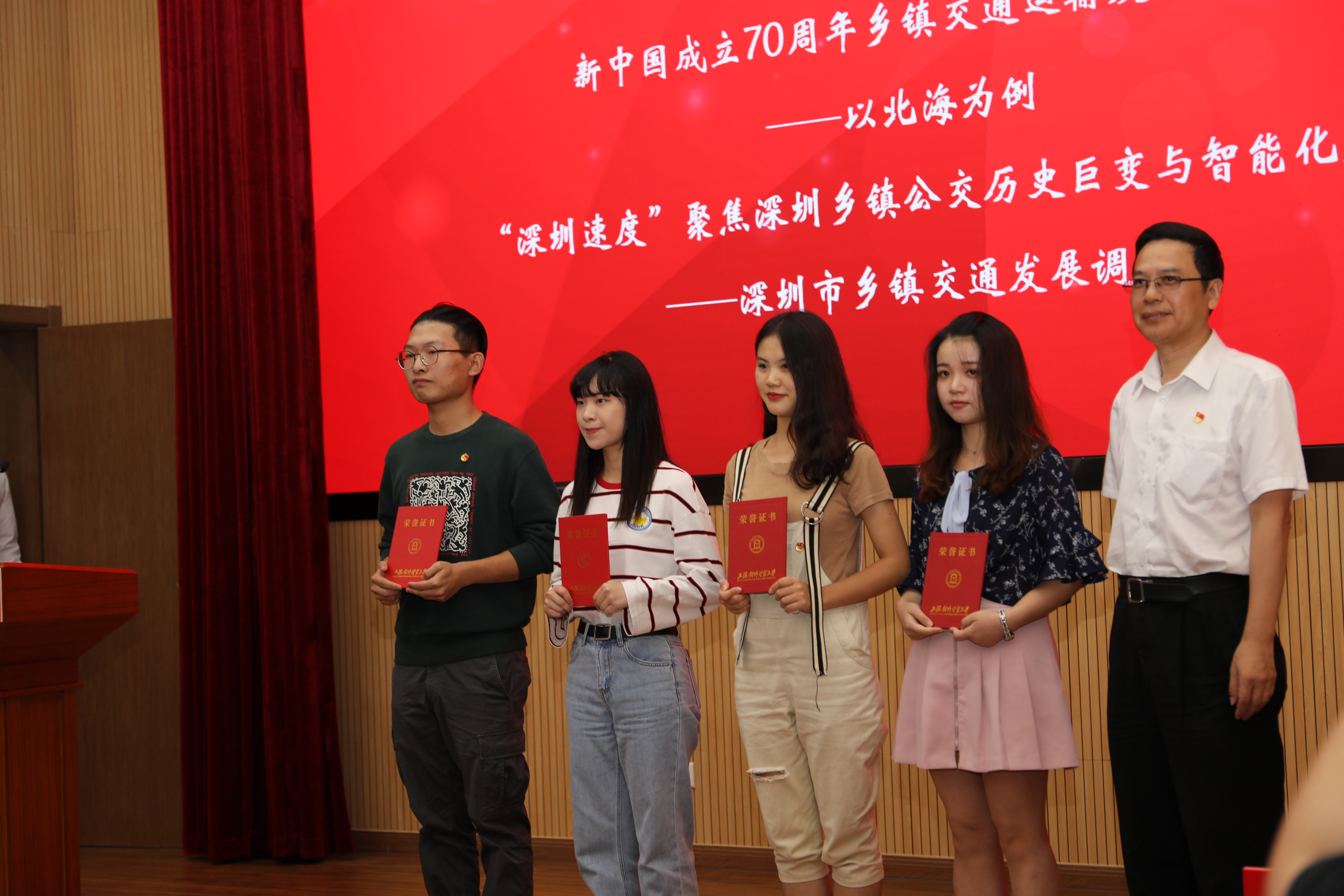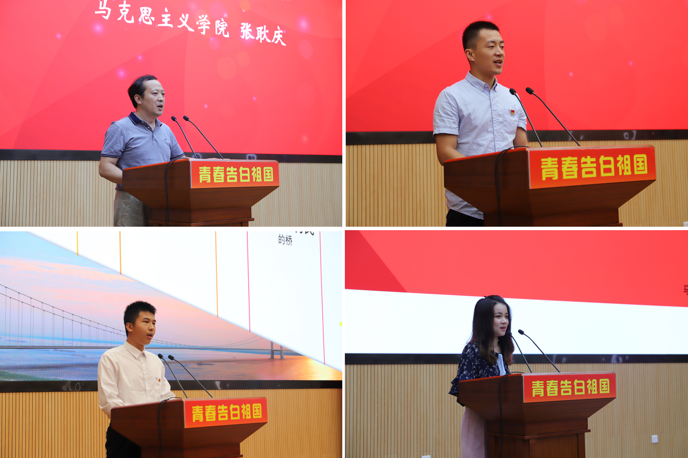 分享会在7名参加暑期社会实践的大学生以“青春告白祖国”为主题的诗朗诵中拉开序幕。缪韵笛宣读了本次专项暑期社会实践的获奖名单,与会领导分别为获奖队伍颁发了荣誉证书并合影留念。