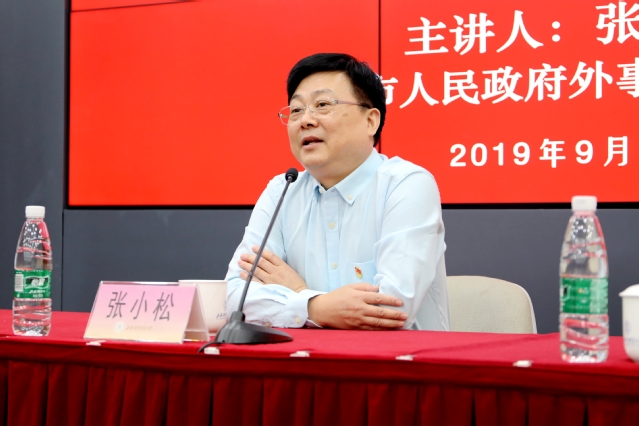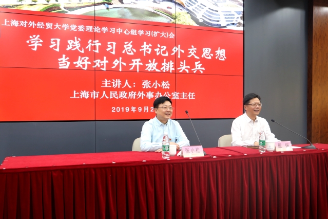 张小松在报告中结合自己从事外事工作的经历,运用大量的事例和数据阐释了习近平新时代中国特色社会主义外交思想的丰富内涵和党的十八大以来中国特色大国外交取得的辉煌成绩。他着重解读了习近平总书记关于“当今世界正面临百年未有之大变局”重要判断的深刻内涵,强调要用习近平新时代中国特色社会主义外交思想指导外事工作,不断增强“四个意识”,坚定“四个自信”,做到“两个维护”,在国际交流和对外交往中展示中国形象,讲好中国故事。最后,他希望学校聚焦服务上?!拔宕笾行摹苯ㄉ?,充分发挥智库决策咨询作用,争当排头兵和先行者。