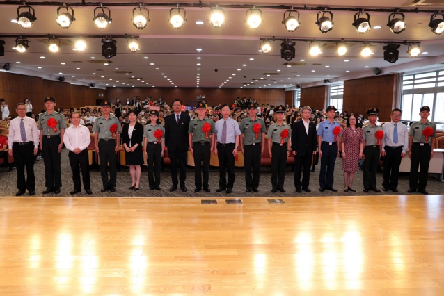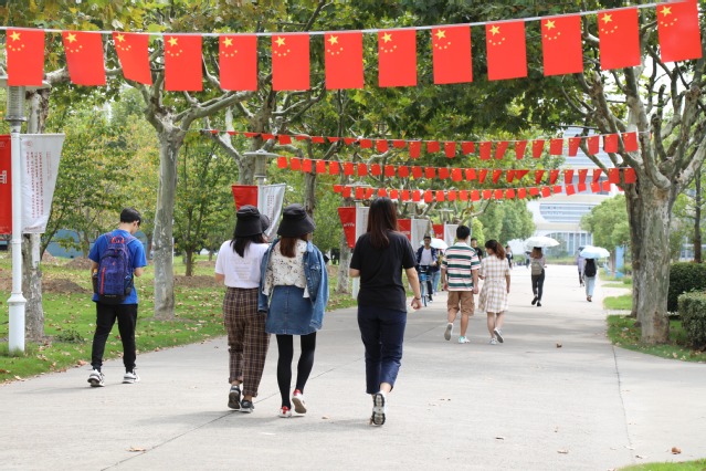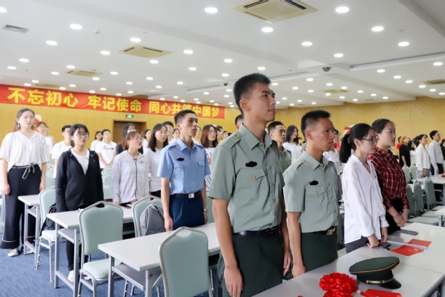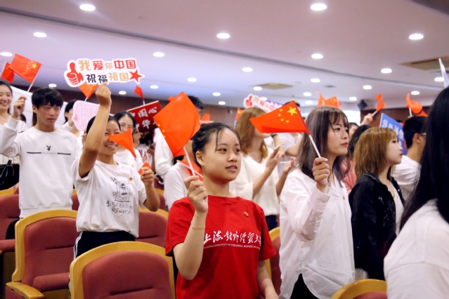 校领导为响应国家号召应征入伍奉献青春的2019年退伍学生进行表彰并授予荣誉胸花。来自校大学生艺术团语言艺术团的同学朗诵了诗歌《闪耀吧,青春的火光》。暑期社会实践带队教师代表、金融管理学院朱晋赤,连续两次参加进博会志愿服务的学生代表、国际商务外语学院施玮懿,退伍学生代表、统计与信息学院来一聪分别作了主题演讲,讲述了他们以不同的方式把青春献给祖国的感人事迹。最后,全场师生共同唱响《我和我的祖国》,表达了对祖国深厚的情感。现场巨幅五星红旗在师生间相互传递,共同凝聚起为祖国发展做贡献的强大力量。