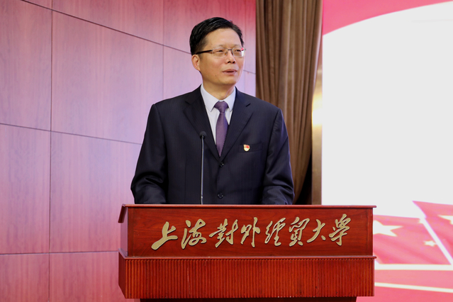 校党委书记殷耀讲话。他指出,庆祝新中国成立70周年主题活动,既是引导广大党员铭记历史、追寻初心的重要形式,也是对青年大学生们进行的一次爱党爱国教育;既是向历史致敬,更是向未来奋进。他强调,要始终坚定理想信念,在坚守初心中成就伟业;要不断强化使命担当,在不懈奋斗中实现梦想。他希望学校各级党组织和全体党员、干部都能以“不忘初心、牢记使命”主题教育为重要契机,深入学习贯彻习近平新时代中国特色社会主义思想,切实增强“四个意识”、不断坚定“四个自信”、坚决做到“两个维护”,以坚定的理想信念坚守初心、滋养初心、践行初心,切实担负起为党育人、为国育才的神圣使命,为国家培养更多优秀的高层次、应用型、国际经贸人才,更好地服务上?!拔甯鲋行摹薄八拇笃放啤苯ㄉ韬腿钚碌闹卮笕挝?,以学校事业发展的新进步、新成绩为祖国献礼。
