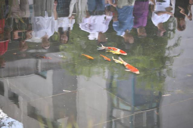 今年10月1日是新中国成立70周年国庆日,10月11日是学校59周年校庆日,全校师生用爱国荣校的满腔热情和丰富多彩的方式礼赞伟大祖国,迎接校庆日。三个支部在联建过程中,结合双庆,围绕“不忘初心 牢记使命”主题教育的主旨,联合共建着眼于美好身边环境,切实服务师生。在讨论主题活动时,外语学院一名党员教师发现,学院楼群中庭,后勤处为师生营造了一个非常惬意的休息环境,但小池却缺乏生机,缺乏与人的互动。为此,三个支部的党员决定以献锦鲤的方式,礼赞祖国70年,迎接校庆,寓意年年有余。在机关党委第十支部书记王宏霞、党员黄宏的大力支持下,后勤部门对池塘提前进行了清理,活动现场129条锦鲤欢快地游向池塘,在绚丽的色彩,搅动的涟漪中,往日沉寂的小池,顿时生机盎然,灵动起来。