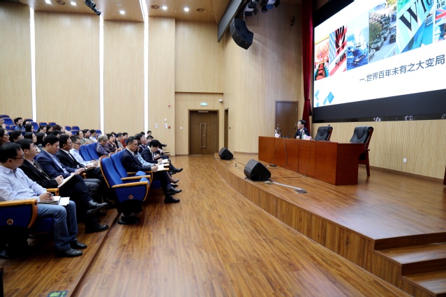 周汉民从习近平总书记关于“当今世界正面临百年未有之大变局”重要判断引入主题,列举了大变局的主要特征和表现,指出当今世界经济复苏、全球化进程、周边环境和地缘政治等各方面都面临变局和不确定性。他回顾了我国改革开放41年历程中浦东开发开放、我国加入世界贸易组织、设立自由贸易试验区三个重要时点和重大举措,指出面对大变局的形势,以习近平同志为核心党中央从容应对,带领全国各族人民始终在实现国家富强、民族振兴、人民幸福的道路上前进。对于上海来说,落实好习近平总书记交予上海新的三项任务是应对世界百年未有之大变局的重要举措。