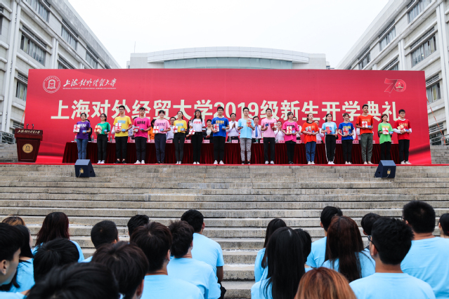 出席典礼的校领导和学院领导为新生代表赠送了?;蘸托Q祷照潞颓笳媸榧?,勉励同学们秉承“诚信、宽容、博学、务实”的校训精神,求真学问、练真本领、胸怀国家、自强不息,努力成为优秀的上经贸大人。