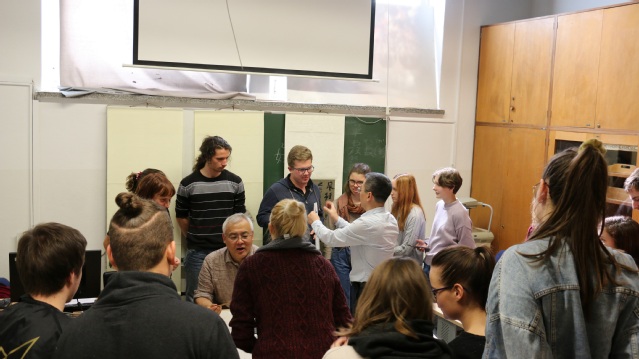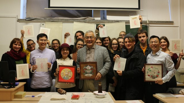 下午,周斌教授与桃花坞木刻年画的两位老师赶赴卢布尔雅那大学文学院课堂??紊?,周教授以轻松幽默的语言、用真实生动的例子向学生讲授了中国书法能益智促健康的独特魅力。