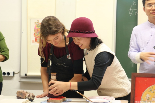 乔兰蓉老师为大家讲解了中国的木板年画的历史、制作工艺等,并邀请师生亲身体验年画的印刷。