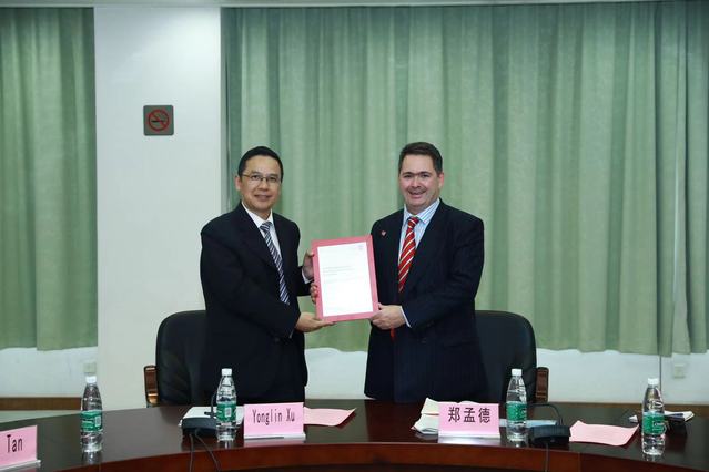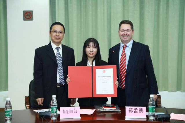 会上,双方参会成员就ACCA的数字化转型、网上课程建设、为师生提供更多学习资源等具体的细节问题进行了热烈的讨论。郑孟德为我校颁发全球考试免九门资格证书。徐永林与郑孟德共同为会计学院许捷飞同学颁发单科全球第一成绩证书。双方互赠纪念品,表达了对未来合作的美好愿景。