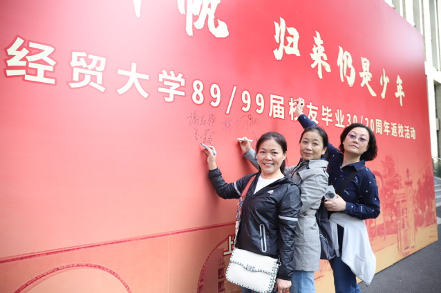 上午9点30分,校友们满面春风地在综合楼相聚,纷纷在签名墙前合影留念,并用金笔在签名墙上留下了属于自己的回忆。每位校友从校友会志愿者与活动筹备组手中接到了一份大礼包,其中有一只定制的杯子,寓意着一辈子不分离的同学情。