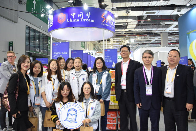 校领导一行来到会展与旅游学院会展经济与管理系师生承接布展的南非商会展台,看望参与布展的学校师生?;嵴褂肼糜窝г旱匙苤榧俏湓鲇?、副书记冯昕和会展经济与管理系主任丁烨向学校领导介绍了展览布展情况,学校领导饶有兴致地了解了胡萝卜汁等南非特产生产工艺,对学生们运用所学理论知识,服务进博会展会实践,提升专业和实践水平表示肯定。