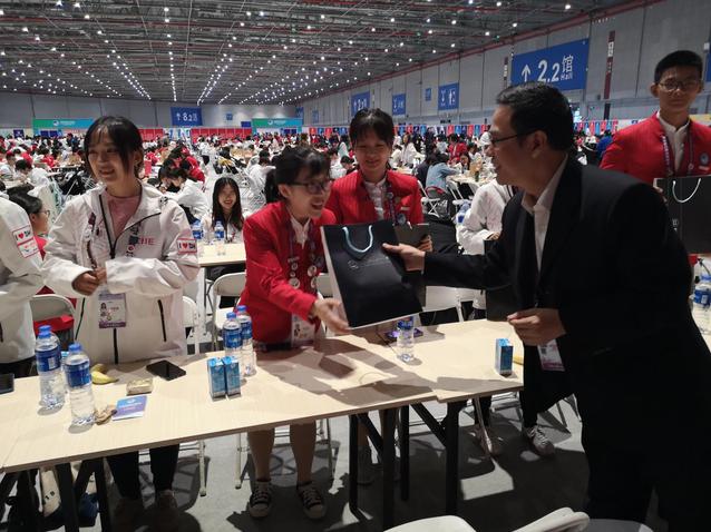 学校领导一行首先慰问了正在岗位上负责综合接待的志愿者,详细了解志愿者们的工作内容、作息情况和服务体会。在交流中,汪荣明校长肯定了志愿者们在进博会场馆践行“奉献、友爱、互助、进步”的志愿者精神,为进博会的成功举办贡献了上经贸大青年的智慧和力量,希望同学们将此次志愿服务经历作为大学中珍贵的回忆,珍惜难得的机会,展现青春的风采。学校领导向志愿者们送上了志愿者专属大礼包,叮嘱同学们工作休息两不误,在接下来的几天中再接再厉,圆满完成志愿服务工作。在志愿者午间休息时间,学校领导还与志愿者们共进工作午餐,与志愿者交谈志愿服务工作情况。