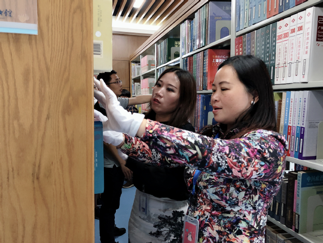 图书上架,建美丽书墙:图书馆开展“我为新馆建设做贡献、我为图书馆发展献真知”主题党日活动,通过图书挑选、下架、运送、上架等多道工序,精选近800册大部头年鉴类图书,按序上架至经贸文献阅览区新落成的书墙,精心布置后的书墙成为了新馆一道亮丽的风景线。