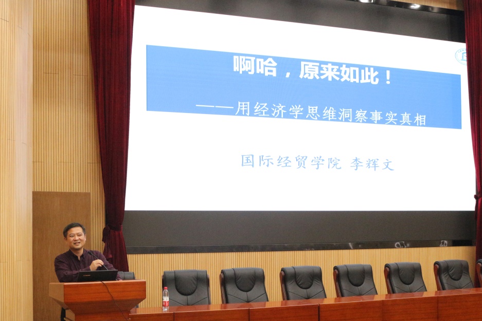 11月8日,国际经贸学院首场“原来如此——学术与人生”系列讲座于图书馆新馆思源报告厅开讲。研究生院副院长(挂职)、国际经贸学院教授李辉文以“原来如此——以经济学思维洞察事实真相”为主题为国际经贸学院300余名本科生和研究生开展专题讲座?;疃晒示逞г旱澄笔榧巧垩泡贾鞒?。