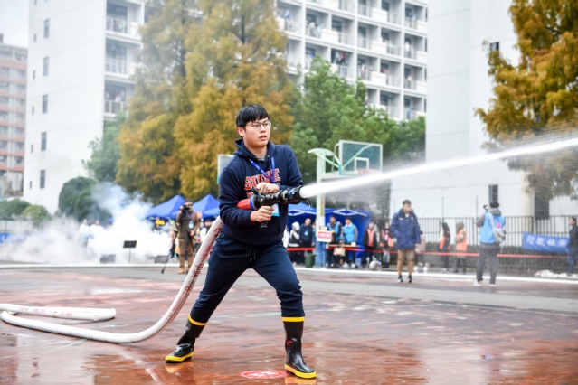 总决赛分为技能操作比赛和理论竞答比赛两大环节。技能操作比赛中,包含“宿舍逃生”和接力灭火两个项目的比拼。在上午的技能操作比赛中,我校选手技能扎实、动作规范、训练有素,受到在场评委和观众的一致好评。