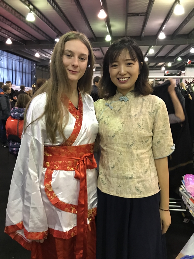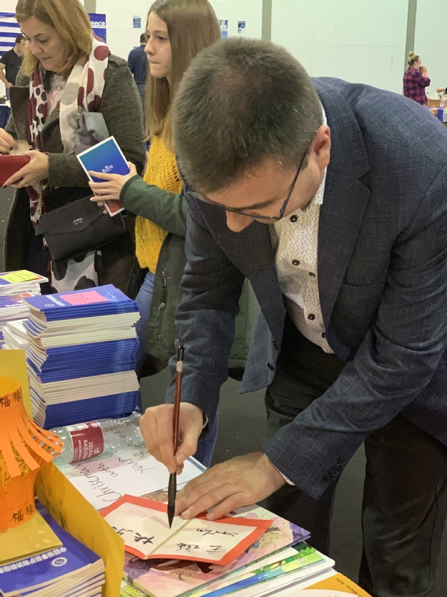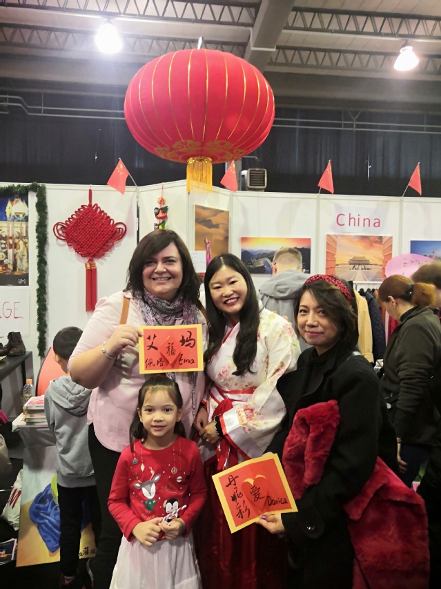 贺卡上用汉字写下对圣诞的祝福,不同的字体,相同的心声?;褂幸晃坏钡嘏笥言谥形牡摹笆サ炖帧毕旅嬗妹市聪驴擞镒8?,体验到了中国书法的乐趣。现场还准备了汉服,当地市民穿上汉服后,欣然与孔子学院教师合影留念。