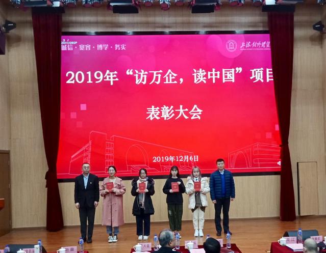 12月6日下午,学校2019年“访万企,读中国”项目表彰大会在思源报告厅401举行。中国对外经济贸易统计学会会长刘贻南、环球慧思信息技术有限公司总裁邵宏华、统计与信息学院院长刘永辉、校党委宣传部部长严大龙、教务处处长龙江、科研处副处长赵蕾、党委学工部副部长刘素贞,校团委书记缪韵笛、校友会秘书处副处长晏琼、统计与信息学院党委副书记韦玉娟、副院长刘慧、郝程程、王利娟以及参与项目的全体师生参加表彰大会。