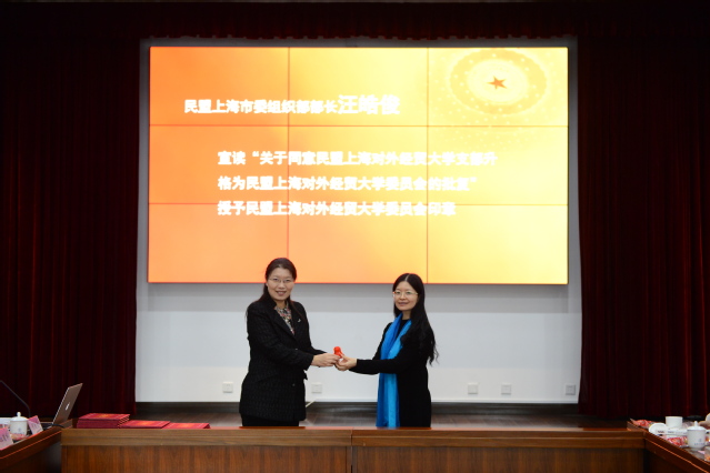 汪皓俊代表民盟市委宣读了民盟上海对外经贸大学支部升格批复,并授予民盟上海对外经贸大学委员会印章。会上宣布了民盟委员会第一届班子成员:唐沛任主委,王朝科、何欢浪任副主委,刘东华、单建国任委员,陆婷瑶任秘书长。