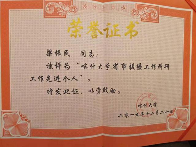 梁振民老师被评为喀什大学省市援建工作科研工作先进个人