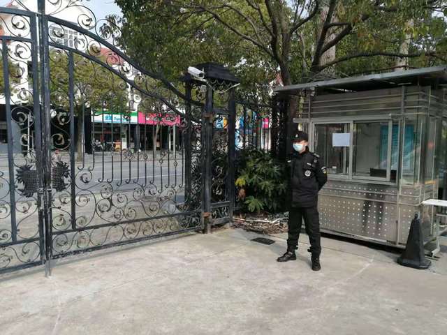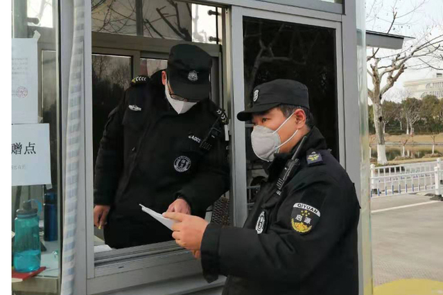 严格校门、宿舍门、楼门的管理,禁止外来人员入校,是学校做好疫情防控工作,保证校园安全的重要环节,而这一重任就落在了保卫处人员和安保团队的肩上。目前,学校保卫处5名同志和59名安保队员全部取消了轮休,参与学校疫情防控的安全保卫工作,做好松江、古北、七宝三校区和学生社区四个区域的保安值勤任务。保卫处承担松江和古北两校区的疫情防控安全保卫工作,加强对两校区安全保卫工作的指导和突发事件的应急处置。在安保团队中,有19名队员因为疫情防控需要,毅然退掉了返乡的车票,投入到疫情防疫工作一线。其中,保卫处马民杰同志自大年初一开始坚持每天到松江校区巡查、安排疫情防控的安保工作,始终坚守在疫情防控第一线。对于队员交接班测量体温、保证健康上岗提出明确要求,同时参与协调后勤、医务等部门和保安服务公司,为队员值勤配发口罩、体温计、酒精棉、消毒药品等必备物品。