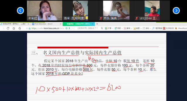 3月2日,国际经贸学院陆文安老师早早打开电脑,开启Zoom视频系统,测试耳麦,检查PPT课件、教学视频的播放情况,一切就序后,在课程微信群里给世界各地的同学们发出了准备上课的友情提醒。“老师,如果现在我去买入人民币,您觉得怎么样?”身在乌兹别克斯坦的GOYIBOV(李友)同学先一步登入课堂直播间,开门见山地向陆老师请教起他关注的汇率问题。“老师,我这里是早上3点钟,我可是设置了手机提醒来上课哦”,远在挪威的FREDRIK BERTEUS(福气)同学向老师和同学们打着招呼。待37名留学生聚齐《宏观经济学》课程“云端课堂”,陆老师以“新冠肺炎疫情对全球经济形势的影响”为题开始了新学期留学生课程直播第一课。