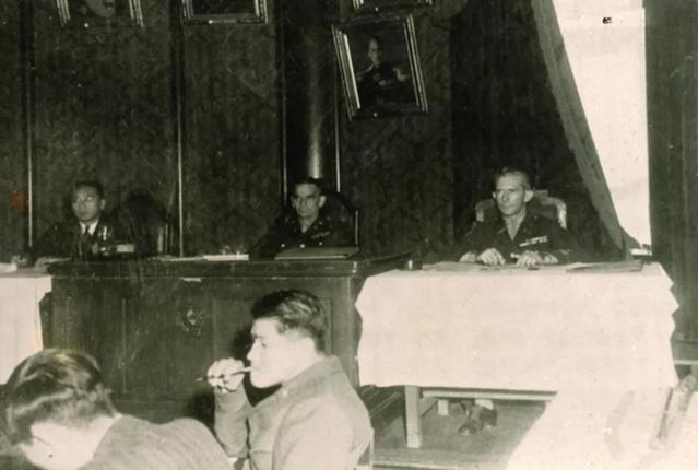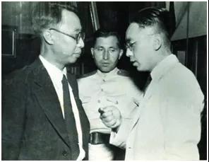 1946年,裘劭恒(右一)与爱新觉罗·溥仪在远东国际军事法庭出庭时交流