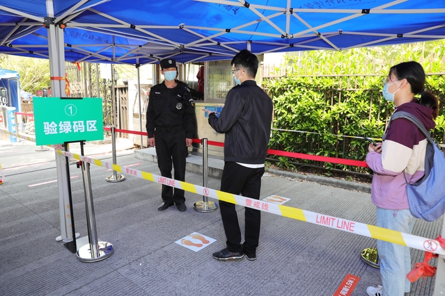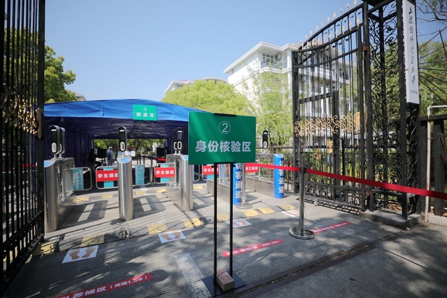 学校在学生社区东门口右侧设置隔离通道,地上粘贴间距标识,学生须佩戴口罩间隔1.5米有序排队,依次进行健康绿码检查,通过人脸识别或者刷校园卡进行身份验证,进入测温区检测体温、接受行李消毒。这是模拟返校学生的演练人员进入学生社区需要过的第一道“关卡”。