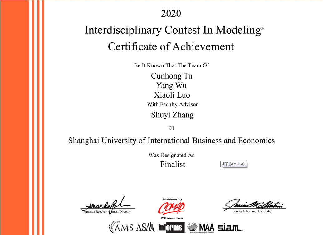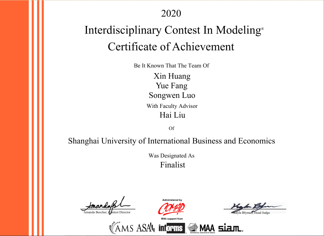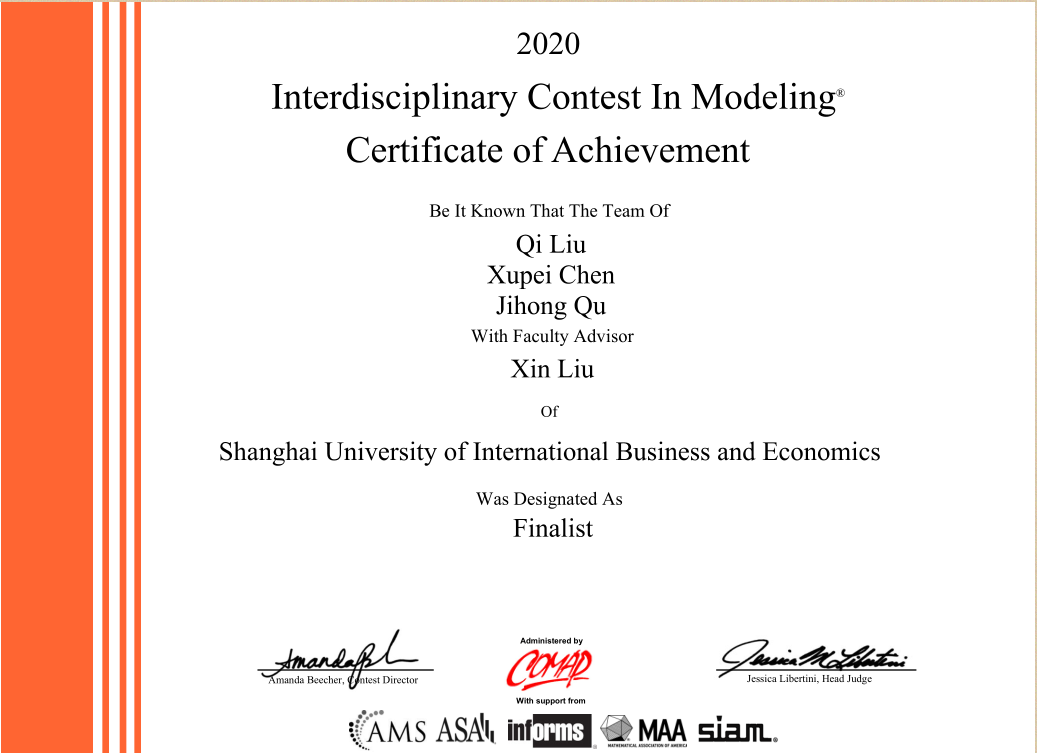 在校期间,队长涂存红参加了多次学术和实践比赛,在这过程中结识到了许多优秀的同伴。报名伊始,涂存红就找到了吴杨,这位国际经贸学院2018级国际经济与贸易(全英班)专业的学弟拥有着丰富的建模竞赛的经验。去年,吴杨在美国大学生数学建模大赛中曾取得S奖和在国赛中取得了上海赛区二等奖的好成绩。而另一位队友罗小丽是她曾经的队友,罗小丽认真负责的态度也给她留下了深刻的印象。“能跟两位优秀的队友一起参赛是一件幸运的事,大家各有所长,而且都没有划水的心态,在比赛的过程中全力合作是我们团队取得还不错成绩的关键?!?/span>涂存红说道。