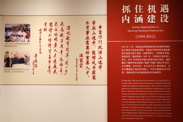 1994年9月,学校由对外贸易经济合作部管理划转为上海市人民政府管理,学校办学的外部环境和服务方向发生重大变化。在新形势下,学校抓住机遇,深化改革,推动发展。2000年,学校松江校区破土动工,2003年学校办学重心转移至松江校区,彻底解决了制约学校发展的“瓶颈”问题,学校办学条件、办学规模、办学层次、办学水平有了新的提升。在办学规模趋于稳定的基础上,学校不断提高办学质量,发展的重点由外延拓展转向内涵建设。
